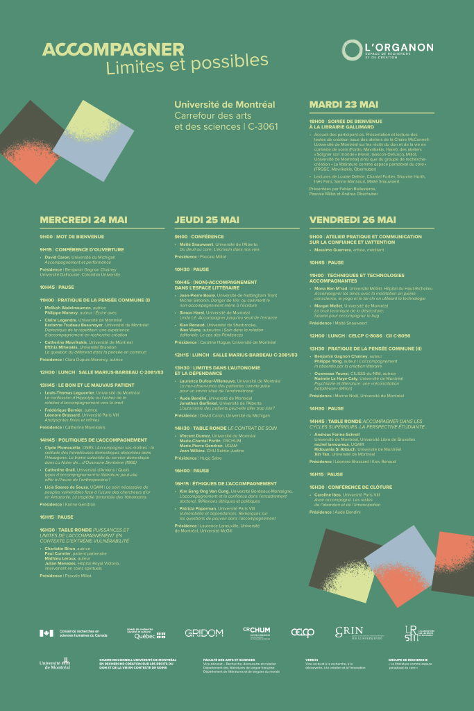 Chaire McConnell-Université de Montréal sur les récits du don et de la vie en contexte de soins • L’Organon : Espace de recherche et de création • GRIDOM : Groupe de recherche interdisciplinaire sur les domesticités • Groupe de recherche : « La littérature comme espace paradoxal du care » • Faculté des arts et des sciences de l’Université de Montréal • Département des littératures de langue française • Département de littératures et de langues du monde • VRRDCI : Vice-rectorat à la recherche, à la découverte, à la création et à l’innovation • CELCP : Centre de recherche des études littéraires et culturelles sur la planétarité • GRIN : Groupe de recherche interuniversitaire sur la normativité • Conseil de recherches en sciences humaines du Canada